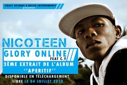 Après le succès de "Blessures et Pansements", 1er extrait de "L'apéritif" dont le clip passe sur les chaines de télévision locales et Africaines; 5e position en top téléchargement sur www.voluncorp.com, Nicoteen lance le 04 juillet prochain le morceau "Glory Online" le 3e extrait de son album "L'apéritif" dont la sortie est prévue pour les vacances 2012.